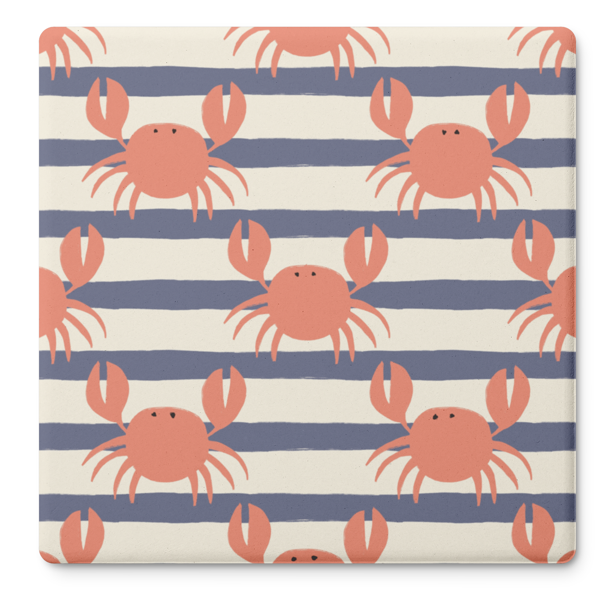 This set of four soapstone coasters features a simple crab motif over soft navy stripes.
