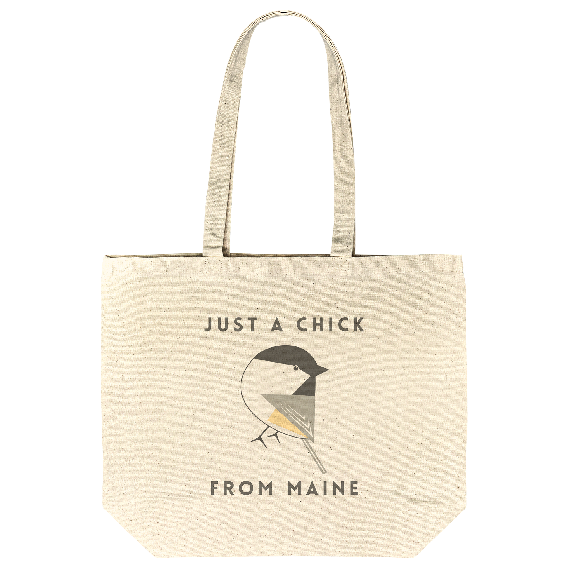 This gusseted cotton tote features the phrase “just a chick from Maine” paired with a charming chickadee, a nod to the state bird and a deep sense of home. Practical, lightweight, and easygoing, it’s perfect for errands, beach days, farmers markets, or everyday toting.