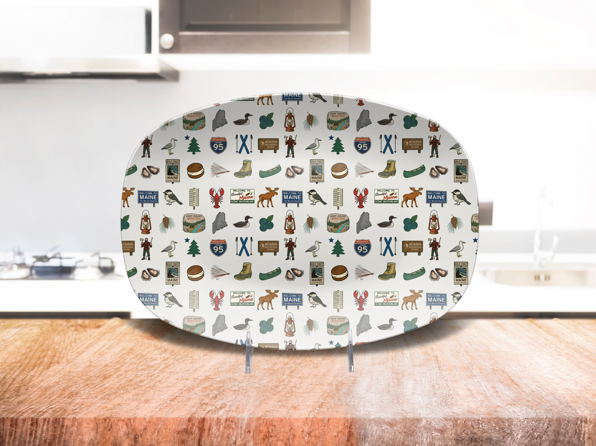 Celebrate the charm of the Pine Tree State with this modern, nostalgic platter featuring a collage of Maine’s most beloved road signs, landmarks, and local icons. From Maine's winding coastal highway to rustic and vintage “Welcome to Vacationland” signs, each element captures the spirit of life Down East.