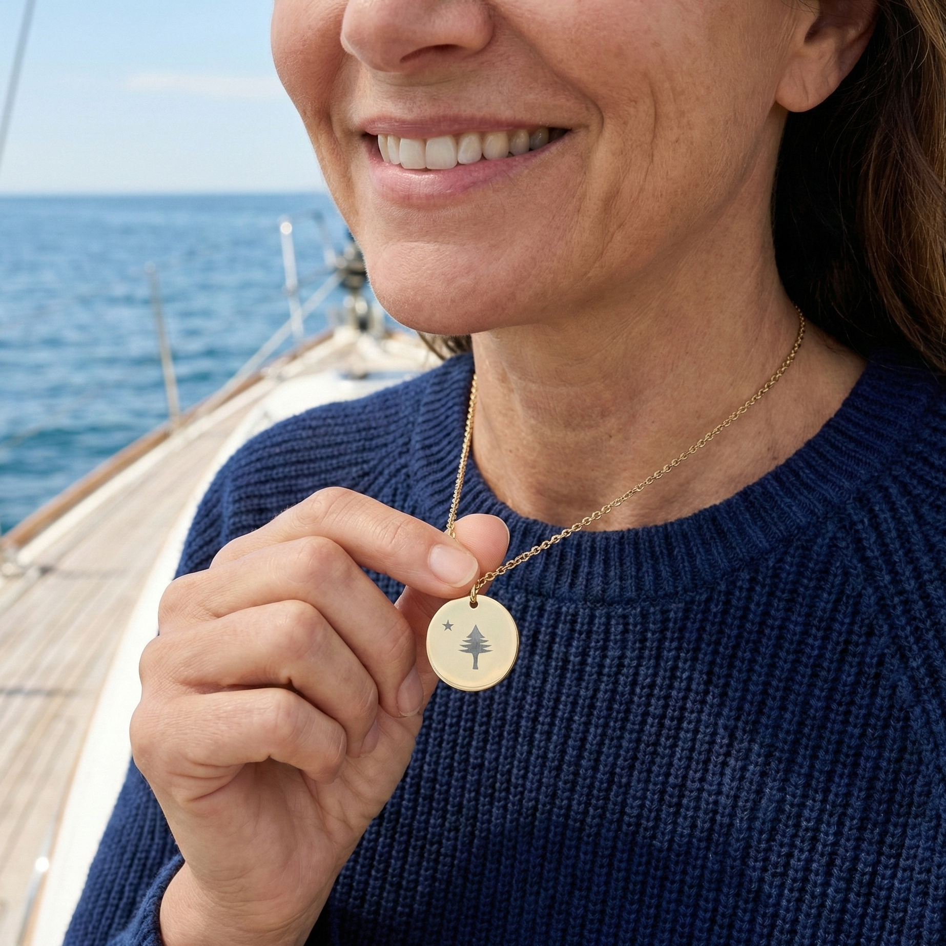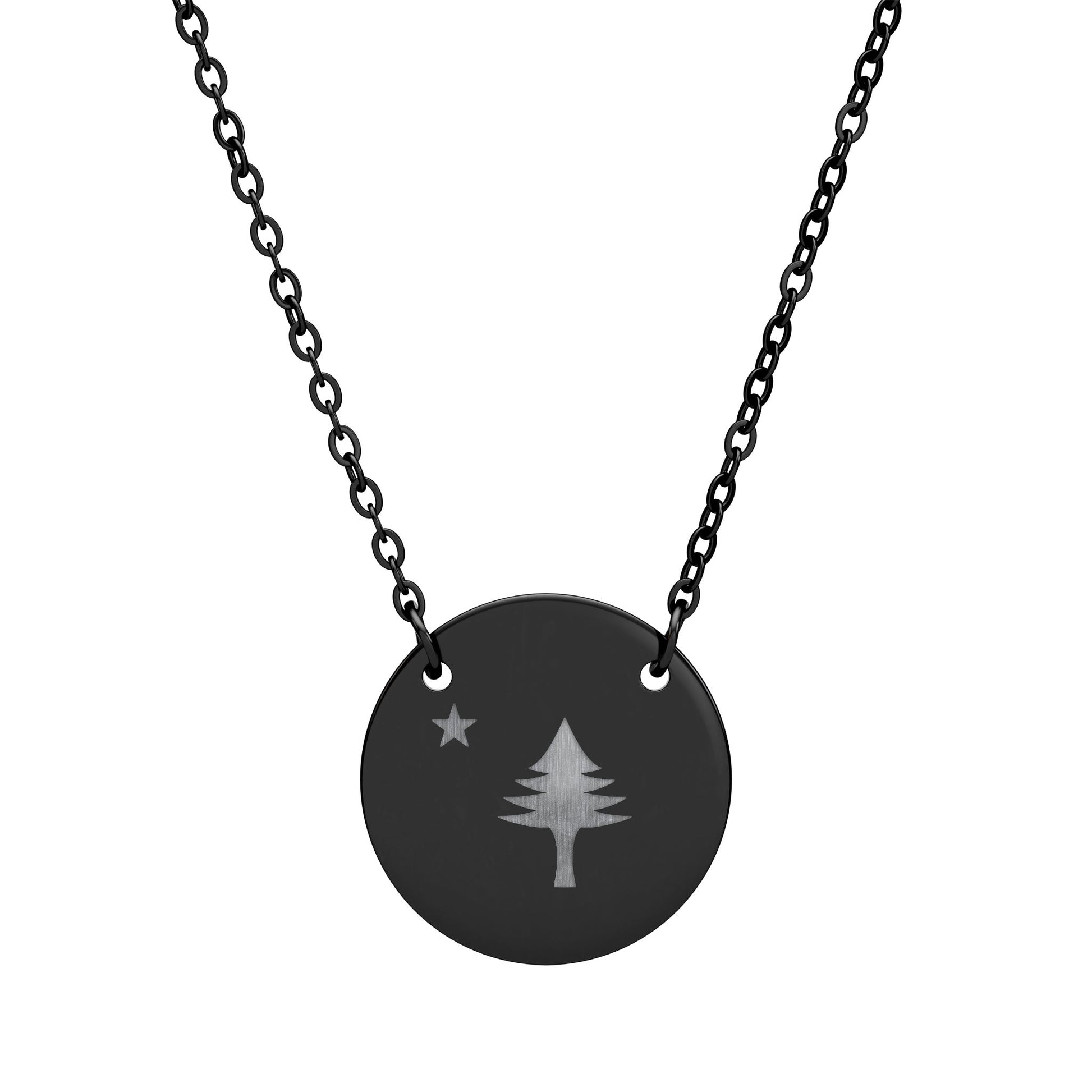 A simple, easy-to-wear necklace with a minimalist pine and star engraving this matches the new "original maine" flag.